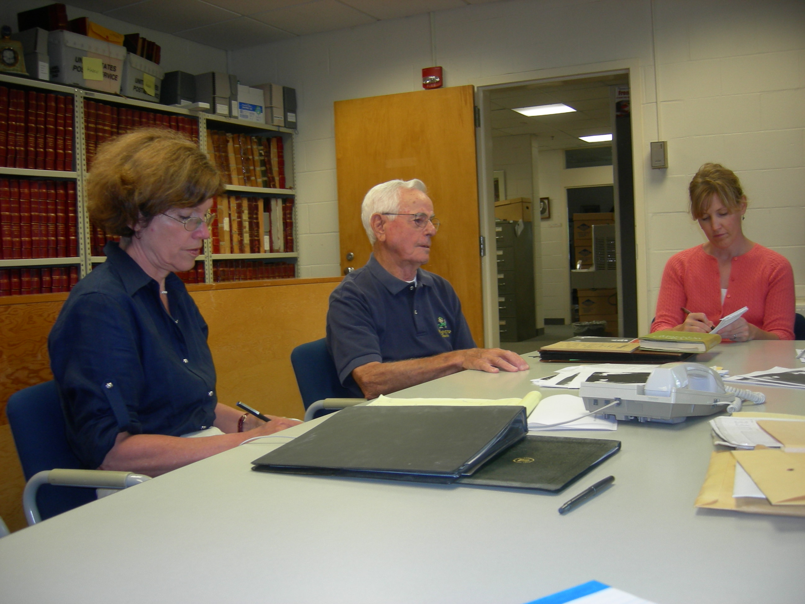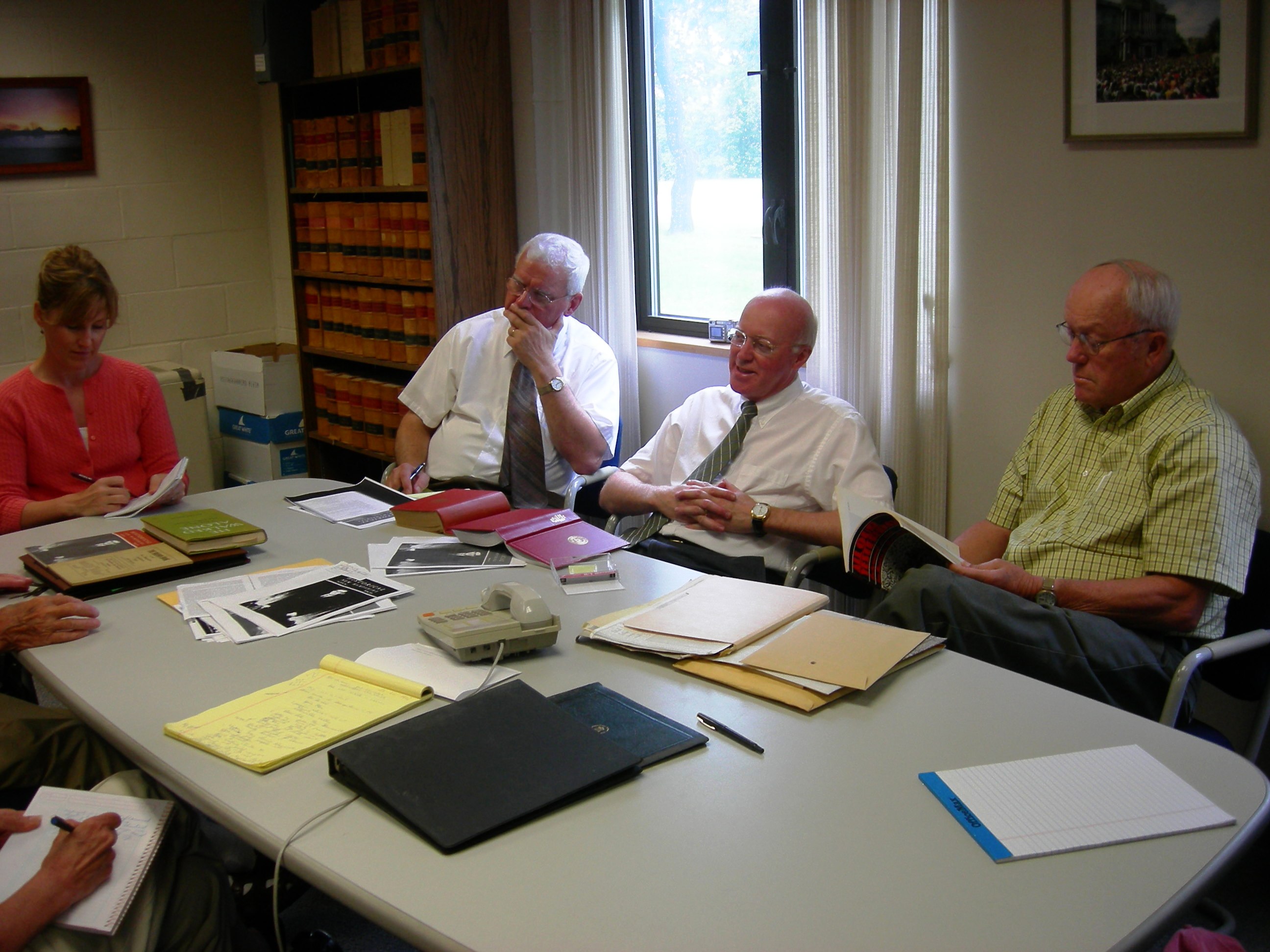 Meeting with Author Lynne Olson at the New Hampshire State Archives, August 25, 2008. Ms. Olson was in New Hampshire doing research for her book, Citizens of London, later published by Random House in February of 2010. Top: Olson, Lou Sillari, age 92, who met Winant as a schoolboy, and Annmarie Timmins, a reporter with the Concord Monitor. Bottom: Timmins, Dr. Frank C. Mevers, N.H. State Archivist, William M. Gardner, N.H. Secretary of State, and Bert Whittemore, who researched Winant's life for the N.H. Historical Society, and whose family was close to Winant. Dean Dexter photo.