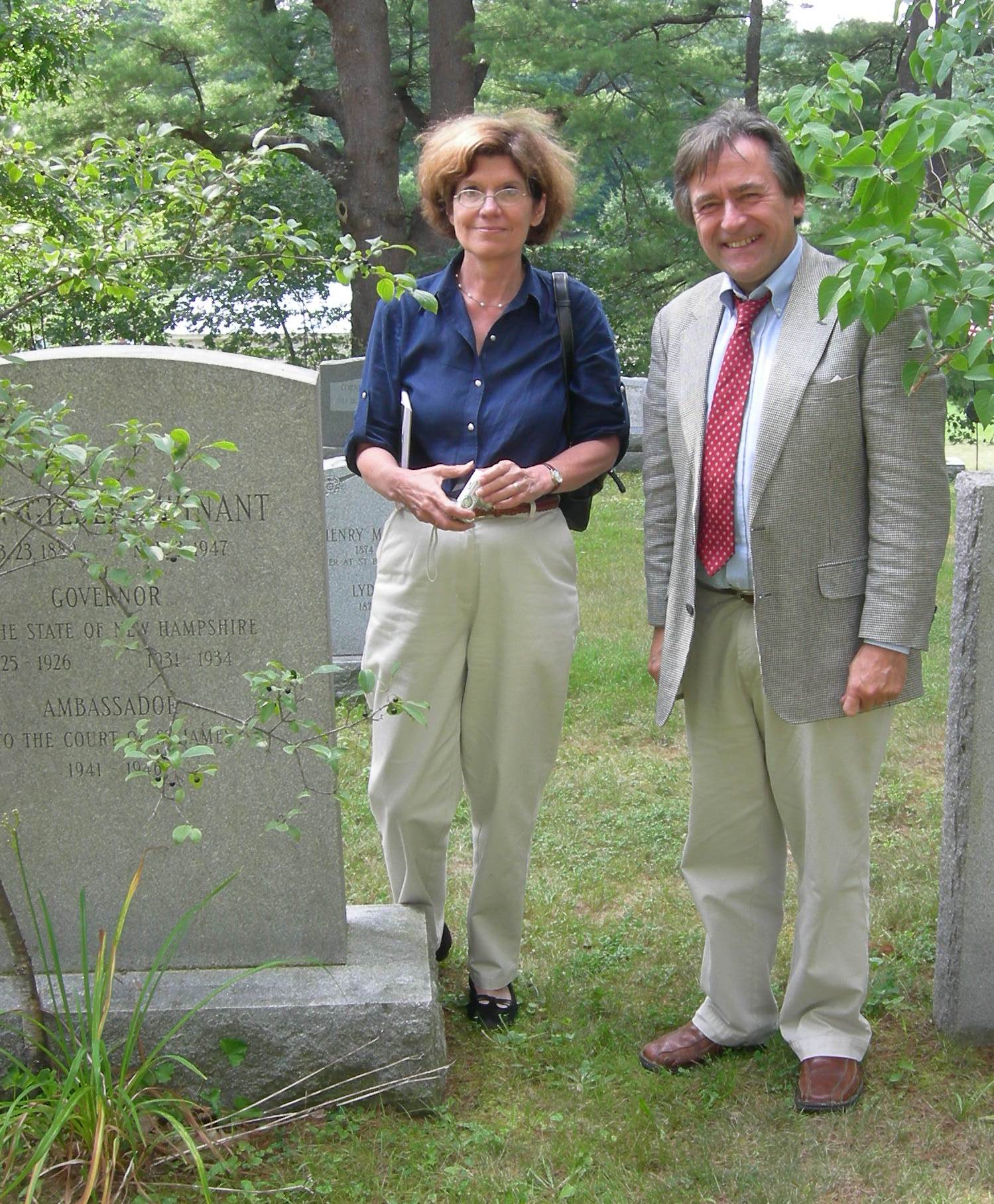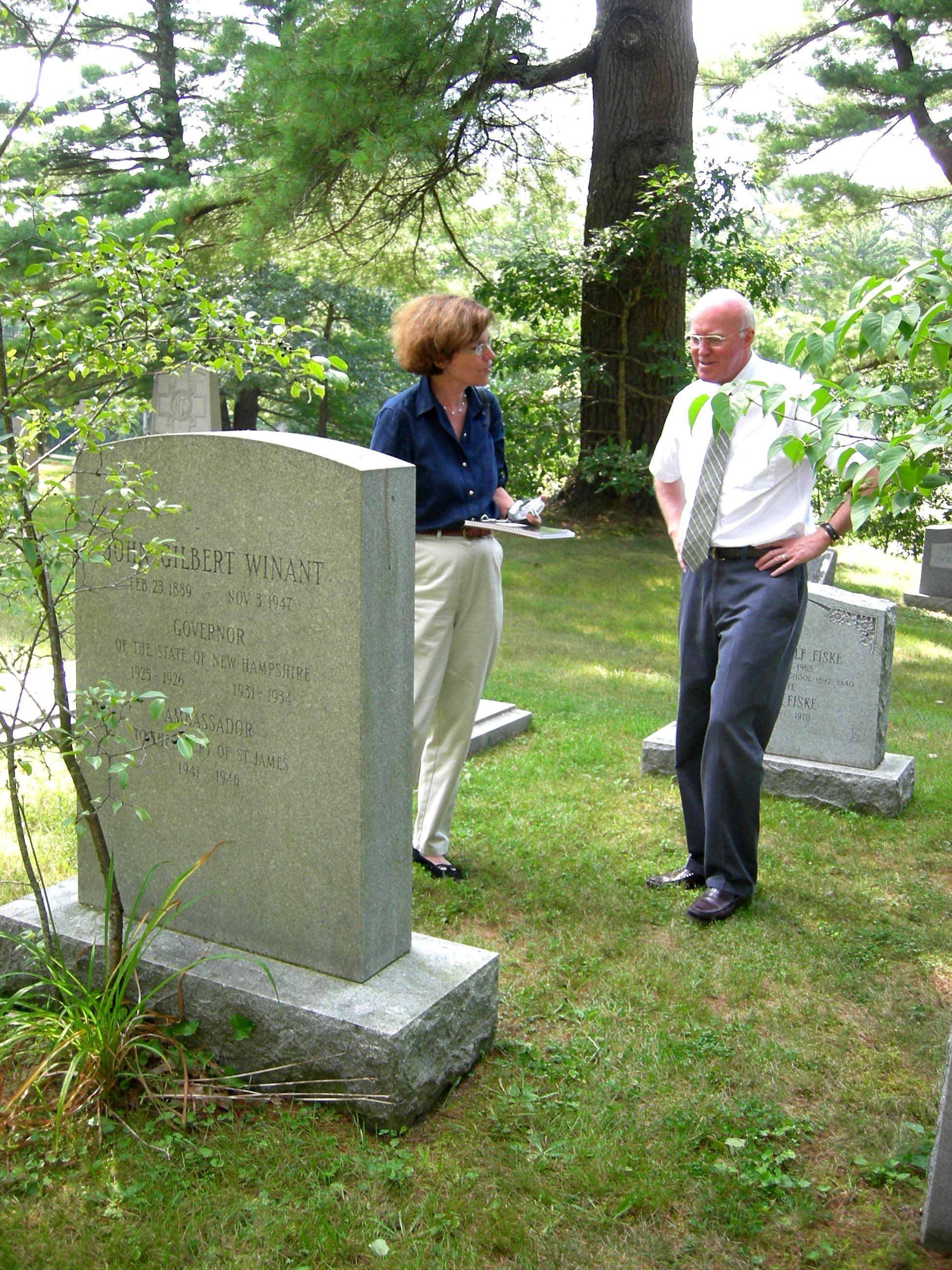New Hampshire Secretary of State Bill Gardner and Author Lynne Olson at John Winant grave, St. Paul's School Cemetery, Concord, N.H., August 25, 2008 -- Dean Dexter photo