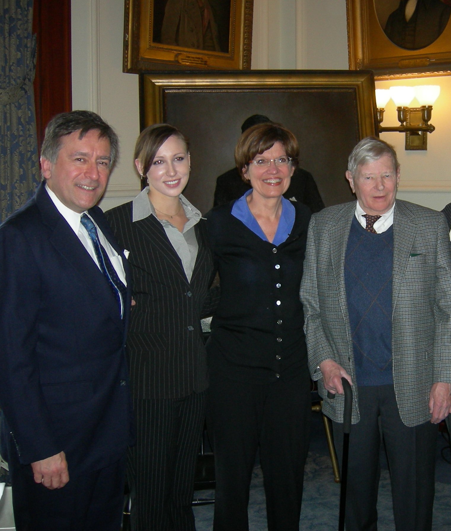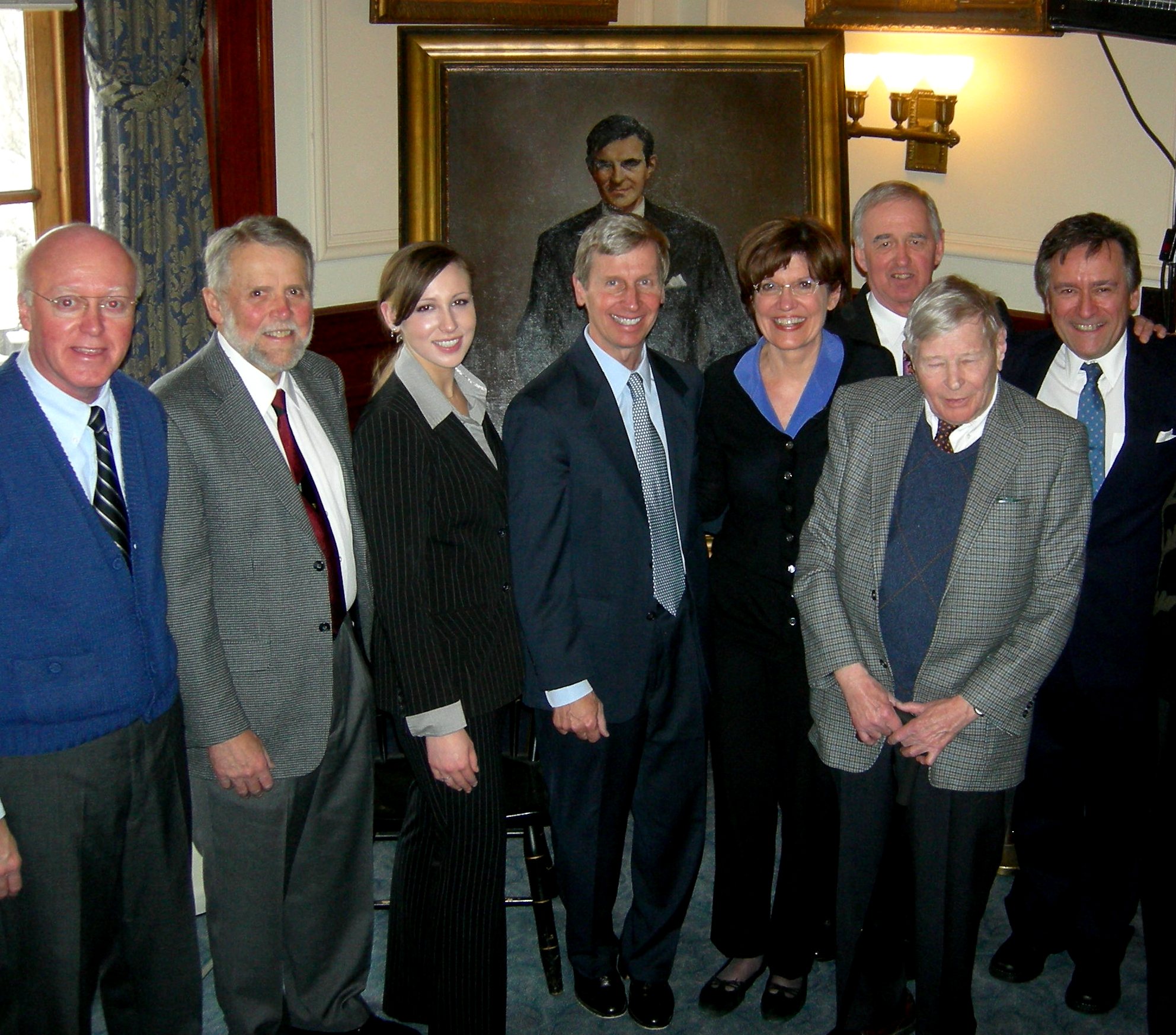 Governor's reception for author Lynne Olson, Executive Chambers, New Hampshire State House, Concord, NH, March 4, 2010. From left NH Secretary of State William M. Gardner event chairman, Mike Pride, author and former editor, Concord Monitor, Abigail Dexter, New Hampshire Governor John Lynch, Olson, Peter Thomson, director, NH Highway Safety Agency, son of the late Governor Meldrim Thomson, Rivington Winant, retired treasurer of the United Nations and son of the late Governor and U.S. Ambassador to London, John Gilbert Winant (portrait in rear), and Dean Dexter, reception emcee.