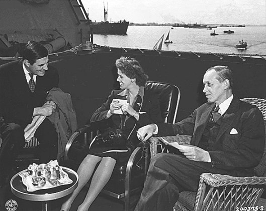 On the deck of a U.S. warship anchored at Cairo as President Roosevelt conferred with the monarchs of three countries on his homeward journey from the Big Three conference at Yalta, Crimea, are John Winant (left), U.S. Ambassador to Great Britain; Mrs. Anna Roosevelt Boettiger, President Roosevelt's daughter, and Harry Hopkins. 02/14/1945. NARA Photo.