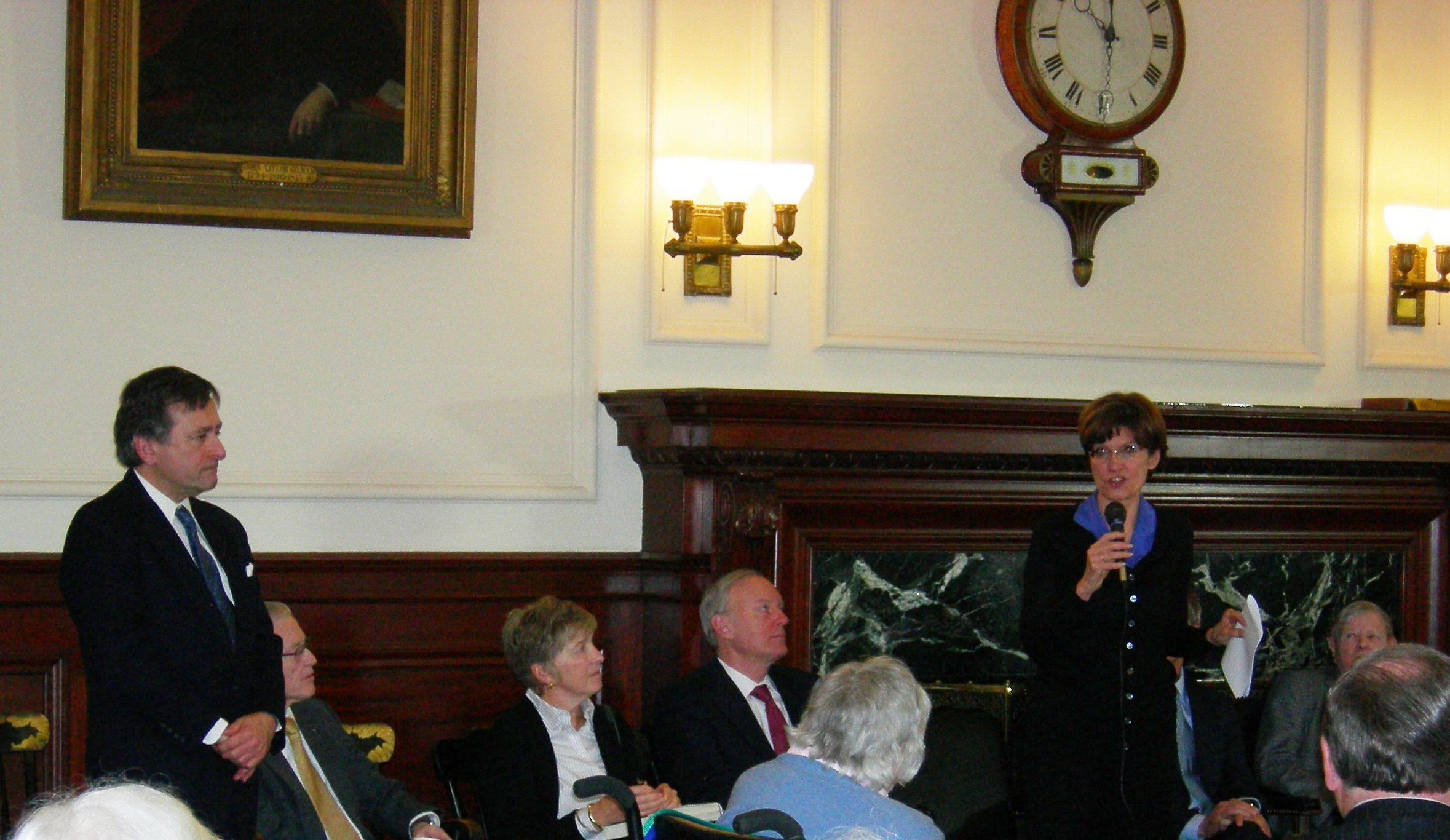 Author Lynne Olson speaking during Governor's reception, Executive Chambers, New Hampshire State House, March 4, 2010. Seated at her immediate right is former Governor Stephen E. Merrill. At far right is Rivington Winant, son of the New Hampshire Governor and U.S. Ambassador John Gilbert Winant, a main subject of her book, Citizens of London. Rivington served 28 years as treasurer of the United Nations. Event emcee, former State Representative Dean Dexter, standing left.