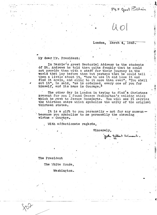 Winant cover letter to FDR, March 4, 1945 regarding his gift of George Washington's walking stick, to the President. (Franklin Delano Roosevelt Library)