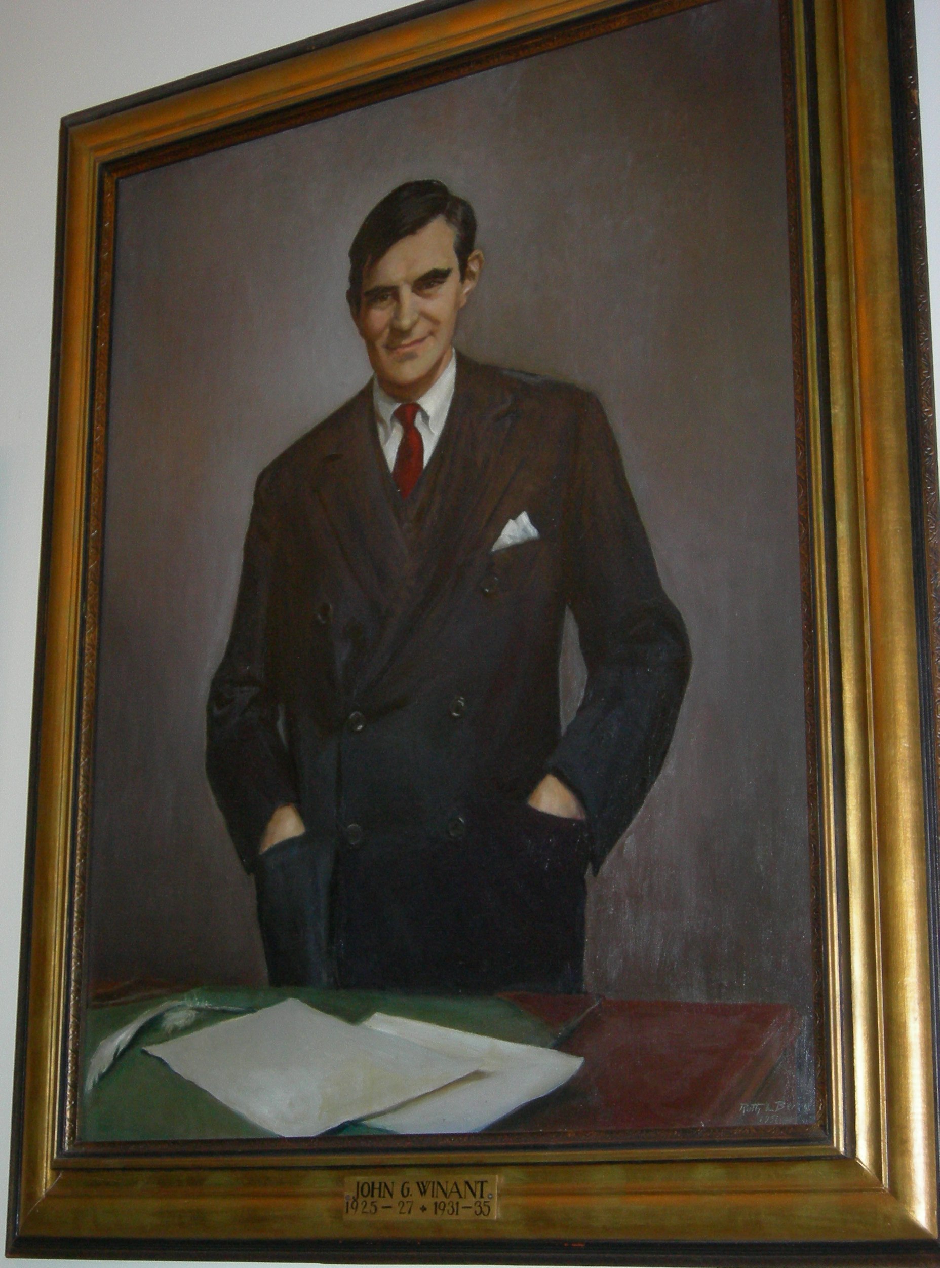 Three-time New Hampshire Governor and World War II U. S. Ambassador to Great Britain (Court of St. James) John Gilbert Winant, state house portrait, second floor hallway, senate side. Ruth L. Berry, oil on canvas, presented at Representatives Hall to a joint session of the Governor and Council and the General Court of the State of New Hampshire, July 25, 1951, 11:00 a.m. Sherman Adams, governor, Blaylock Atherton, president of the senate, Lane Dwinell, speaker of the house. Dean Dexter photo.