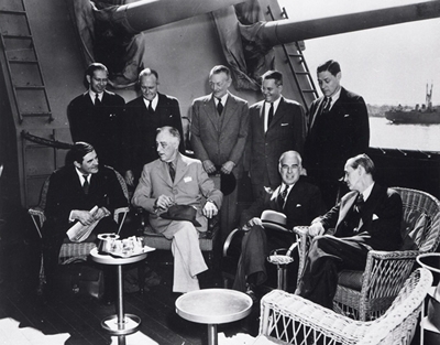 Seen on the cruiser Quincy in Egypt after the Yalta Conference in February 1945, are (seated, left to right) U.S. Ambassador to the United Kingdom John G. Winant; President Franklin D. Roosevelt; Secretary of State Edward R. Stettinius, Jr.; Special Assistant to the President Harry L. Hopkins; (standing, from right) Assistant to the Secretary of State Charles E. Bohlen; State Department Director of European Affairs H. Freeman Matthews; and others.