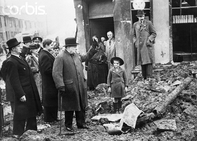 British Prime Minister Winston Churchill (center) gestures to residents of Bristol, which came under heavy bombing by Germany. "We shall let them have it back," Churchill told the bombing victims. Behind Churchill is American Ambassador John G. Winant. April 22, 1941, Bristol, Gloucestershire, England, UK.