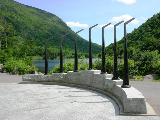 Note: The Old Man of the Mountain Profile Plaza, with these seven "profilers" as they're called, was dedicated in June 201l, and is located at Exit 34B from I-93. There is a museum and gift shop near the plaza, and an exhibit in the nearby Cannon Mountain Tramway Building. For more information, visit this site: Old Man of the Mountain Legacy Fund