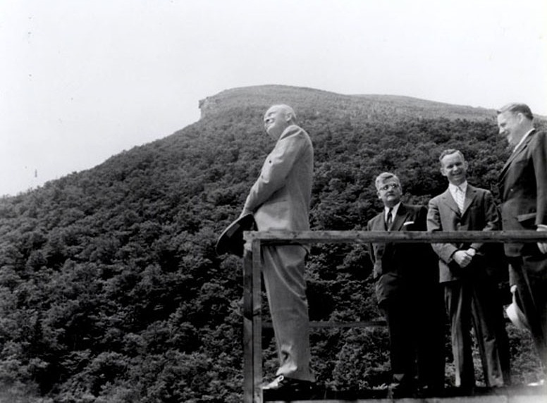 President Dwight D. Eisenhower visits New Hampshire's 'Old Man of the Mountains,' June 24, 1955. From left: First District N. H. Congressman Chester E. Merrow of Ossipee; Second District Congressman Perkins Bass of Peterborough; Governor Lane Dwinell of Lebanon. Ike's visit was to commemorate the 150th anniversary of the discovery of the profile in 1805 by road surveyors from the seacoast.