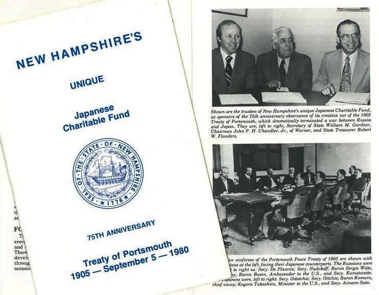 A booklet briefly explaining the Treaty of Portsmouth and the Japanese Charitable Fund was issued in 1980 commemorating the seventy fifth anniversary of the Treaty. Pictured on a page above, at right are the three trustees at the time: Secretary of State William M. Gardner, State Senator John P. H. Chandler, and State Treasurer Robert W. Flanders.