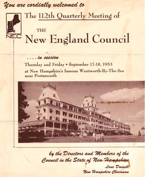 1953 Quarterly Meeting program, The New England Council, hosted by Co-Chairman and New Hampshire Governor Lane Dwinell.